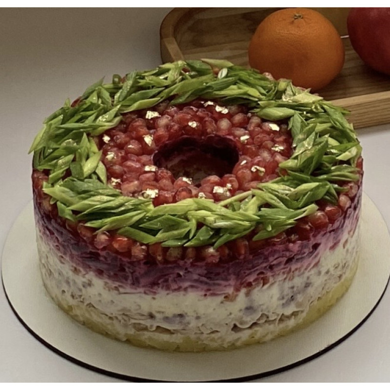 Куриное филе/картофель/морковь/яйцо/свекла/грецкий орех/гранат/зеленый лук/майонез
